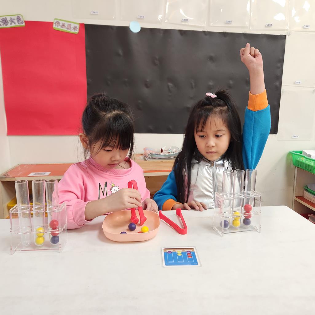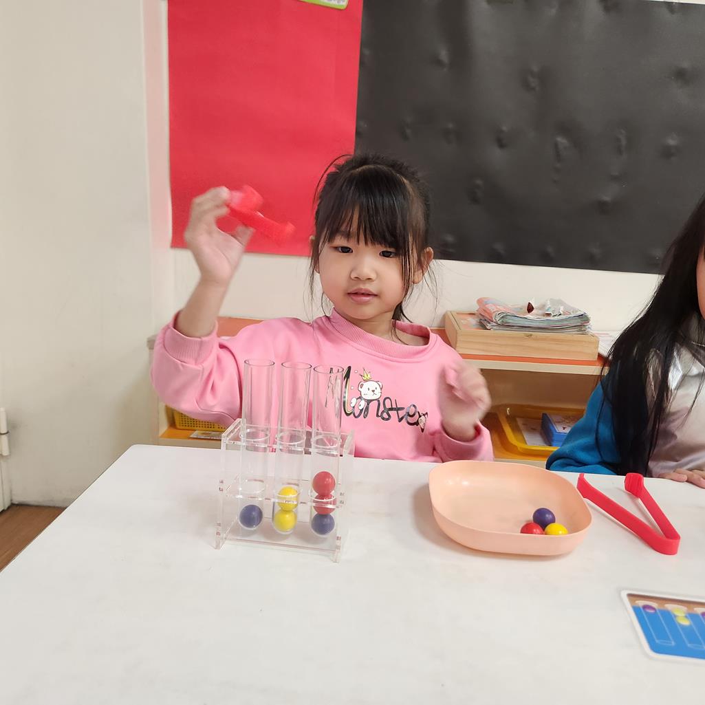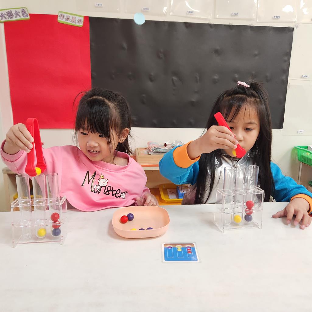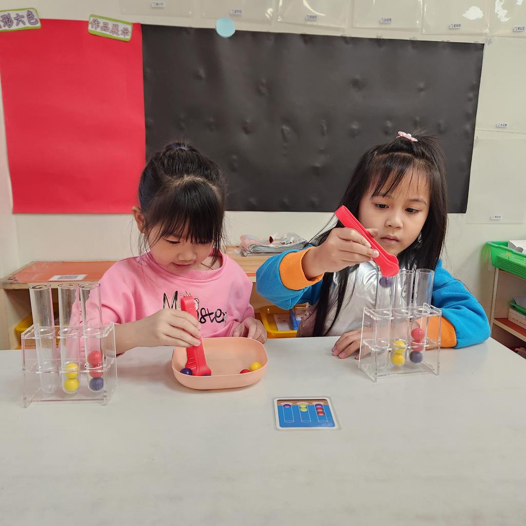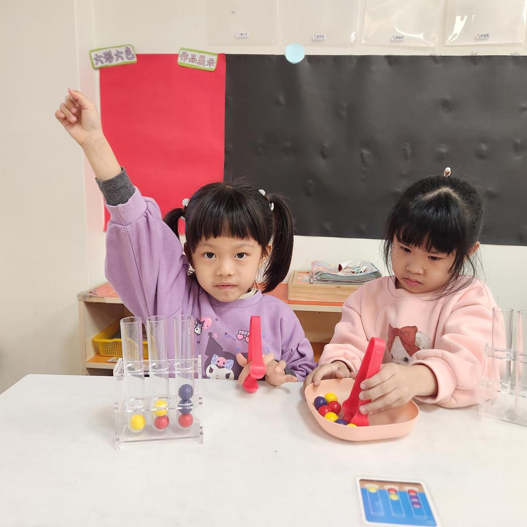 第二關~抽車一張題目卡,與小朋友依照題目卡用夾子夾球放入正確位置 .練習手眼協調及空間思維.