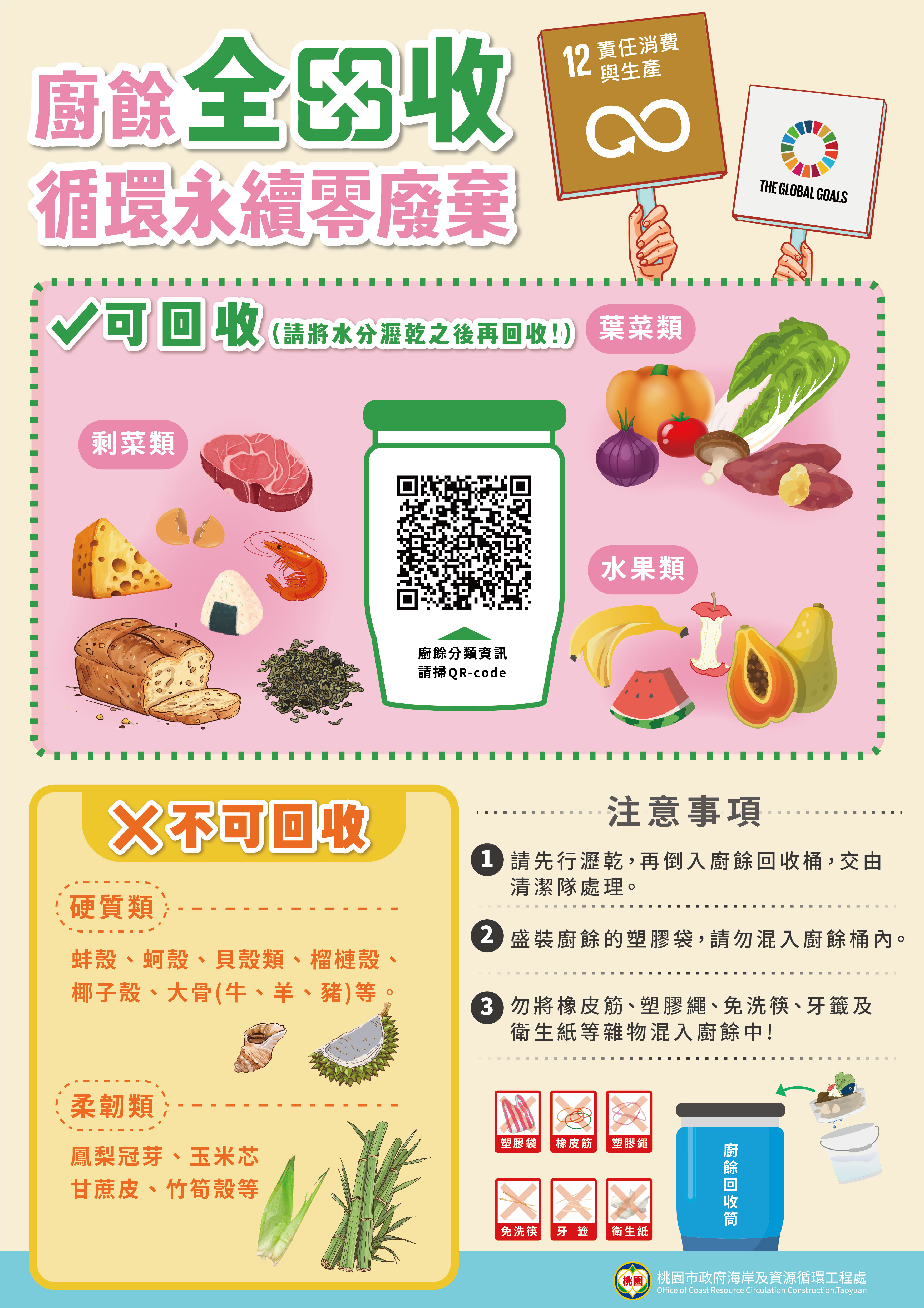2.民眾回收廚餘前,請瀝除水分後,可回收請投入廚餘桶,不可回收請丟入垃圾車。